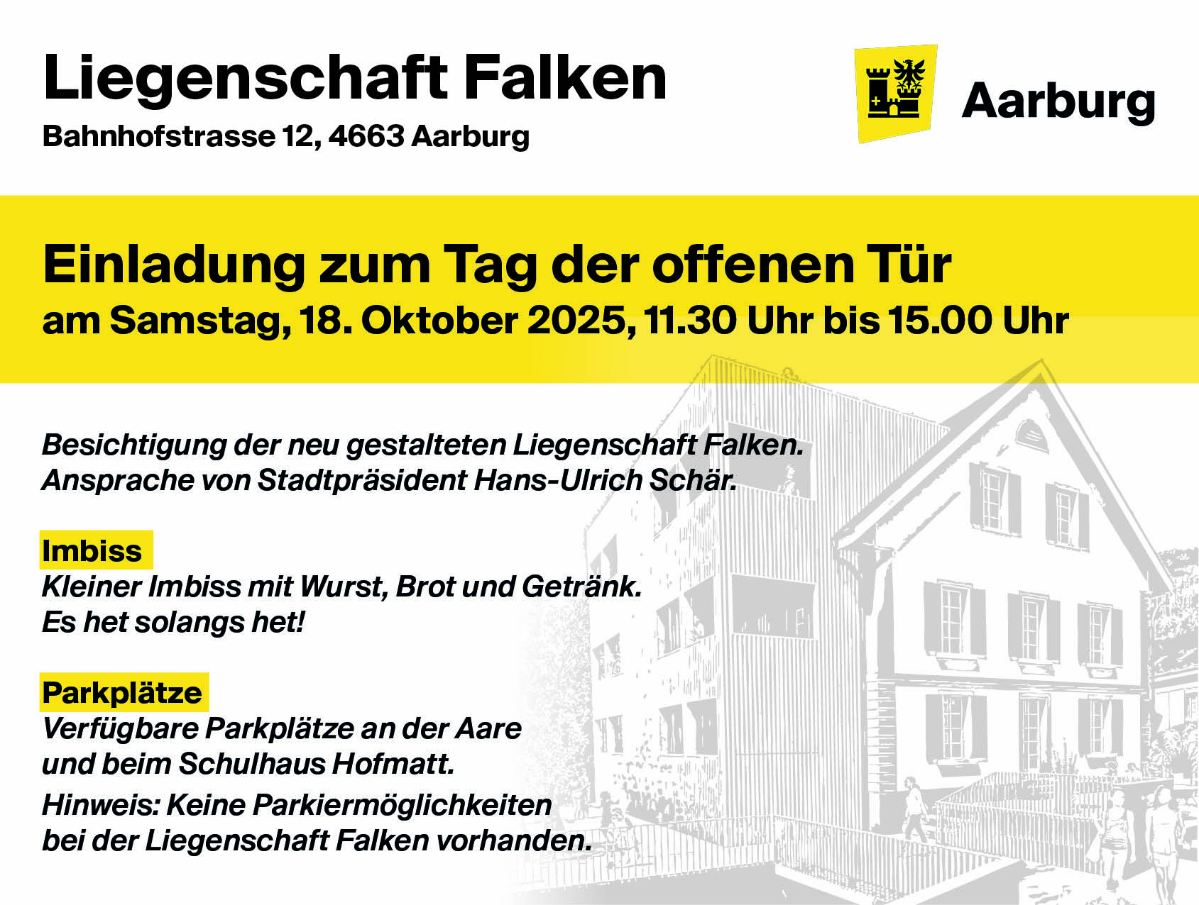 Einladung zum Tag der offenen Tür – Liegenschaft Falken, Bahnhofstrasse 12, 4663 Aarburg – Samstag, 18. Oktober 2025 von 11.30 Uhr bis 15.00 Uhr